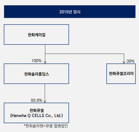 한화그룹은 2015년 한화솔라원과 큐셀을 합병했다. 한화솔라원이 큐셀을 흡수하는 방식이었다. 큐셀인베스트먼트 지분을 한화솔라원에 현물 출자하면서 현재의 '한화큐셀(Hanwha Q CELLS Co., Ltd.)'이 탄생했다. 한 쪽으로 지분을 집중시키면서 한화솔라홀딩스는 한화큐셀의 지분율을 94%대까지 올렸다. 동시에 한화솔라원이 상장사였기 때문에 큐셀은 우회 상장 효과도 봤다.