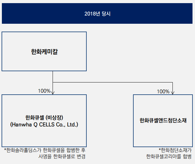 2018년 한화케미칼은 한화솔라홀딩스와 한화큐셀(Hanwha Q CELLS Co., Ltd.)을 다시 한번 합병했다. 한화솔라홀딩스(비상장사)가 한화큐셀(상장사)을 합병하는 방식으로 이는 곧 나스닥 시장에서의 상장 폐지를 뜻했다. 시장 유통 지분 6%를 약 500억원에 인수하면서 한화큐셀은 한화케미칼의 100% 자회사가 됐다.