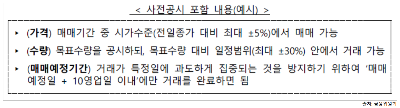 ⇒장외거래 중 주식양수도 방식 M&A, 연기금 지분 매매 등은 사전공시 예외로 하는 것을 하위 규정 마련 시 검토