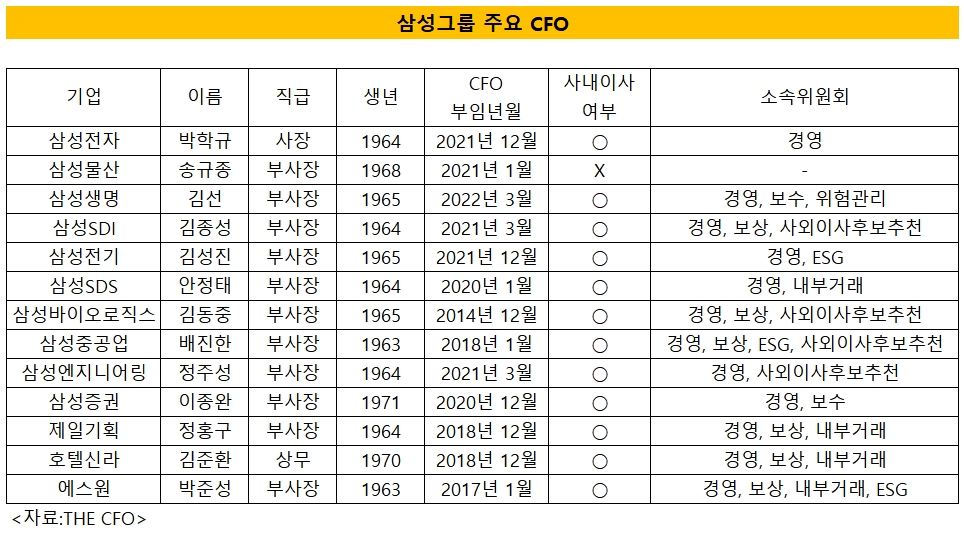 THE CFO가 국내 250대 기업 CFO 정보를 분석한 결과 재계 1위 삼성그룹은 13개 계열사 가운데 삼성물산을 제외한 12개사(92.3%)가 CFO를 사내이사로 선임하고 있다. 박학규 삼성전자 부사장과 △김선 삼성생명 부사장 △김종성 삼성SDI 부사장 △김성진 삼성전기 부사장 △안정태 삼성SDS 부사장 △김동중 삼성바이오로직스 부사장 △배진한 삼성중공업 부사장 △정주성 삼성엔지니어링 부사장 △이종완 삼성증권 부사장 △정홍구 제일기획 부사장 △김준환 호텔신라 상무 △박준성 에스원 부사장 등이다.