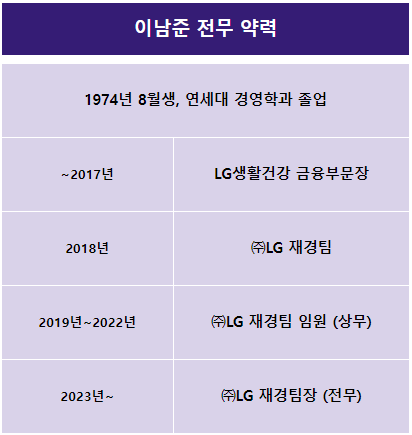 이남준 전무는 1974년생으로 연세대 경영학과를 졸업했다. LG생활건강에서 금융부문장을 맡다가 2017년 말 인사를 통해 ㈜LG 재경팀으로 이동했다. 이후 1년 뒤인 2018년 말 임원 인사에서 상무로 승진했다. 이 전무의 상무 승진 시기는 구광모 회장이 회장 부임 이후 실시한 첫 임원 인사로 하범종 사장이 ㈜LG의 재경팀장으로 선임됐던 시기다.