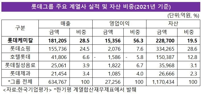 한기평에 따르면 롯데그룹 지난해 합산 영업이익은 2조7256억원이었는데 롯데케미칼이 번 돈이 1조5356억원으로 56.3%를 담당했다. 롯데쇼핑은 7.6%(2076억원), 롯데칠성음료 6.7%(1822억원), 롯데제과는 4%(1085억원)에 그치고 호텔롯데는 1586억원 적자였다.