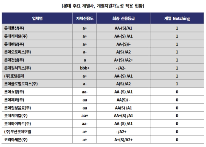 건설을 지원한 롯데케미칼(AA+)과 롯데지주(AA0), 롯데물산(AA-) 뿐 아니라 지원하지 않은 계열사들도 다수 포함됐다. 롯데쇼핑(연대보증채 AA0)과 롯데캐피탈(AA-), 롯데렌탈(AA-), 롯데오토리스(A0) 등이다.