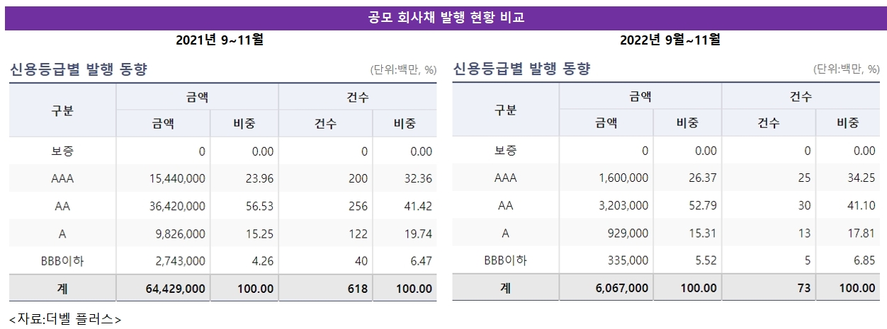 우량한 AA급 회사채도 미달이 나는 경우가 있어 도전을 하지 않는 곳이 많아졌다. 더벨 리그테이블에 따르면 지난해 9월~11월 AA급 발행규모는 36조4200억원이었는데 올해 같은 기간엔 3조2030억원으로 쪼그라 들었다. A급 이하는 더 어렵다. A급은 지난해 같은 기간 9조8260억원에서 올해 같은 기간 9290억원이 됐다.