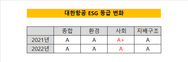한국ESG기준원은 올해 대한항공의 ESG(환경·사회·지배구조) 각 부문에 모두 A등급을 매겼다. 사회 부문이 한 계단 내렸고 지배구조와 환경은 전년과 같은 등급을 받았다. 대한항공은 부문별 A등급을 획득해 3년 연속 종합 A등급을 지키게 됐다