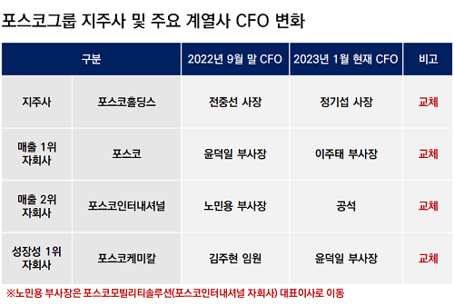포스코그룹은 지난해 말과 올해 초 인사에서 최고재무책임자(CFO) 역할을 하는 임원들을 대거 교체하는 강수를 뒀다.