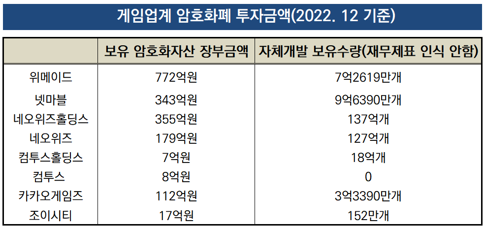 한 게임사 관계자는 "가상자산을 투자자산의 한 영역으로 보고 있는 만큼 매매차익을 노리고 투자한 것"이라며 "시장 스터디 차원에서 우량코인 위주로 매입한 부분도 있다"고 말했다.