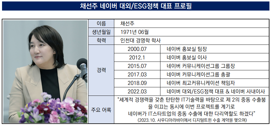 2023년 네이버 최대 업적으로 꼽히는 사우디아라비아 등 글로벌 기술수출을 채 대표가 주도한 셈이다. 네이버는 현재 해외매출 비중 확대를 핵심 경영목표로 내걸고 있는데 기존의 사업 외에 기술수출을 통해 이런 목표에 한 발짝 더 다가섰다.