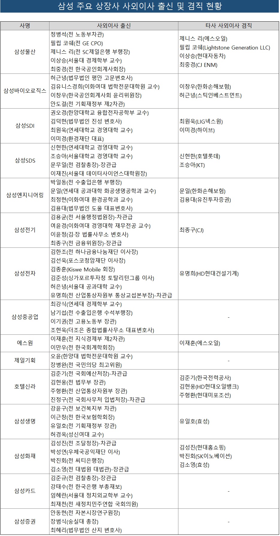 삼성 관계자는 "사외이사 요건이 까다로워 인력풀이 겹치는 경우가 더러 있다"며 "법규상 2개 이상의 다른 상장사에 겸직하지만 않으면 되기 때문에 문제 되진 않는다"고 말했다.