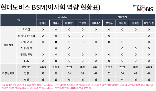 현대모비스 BSM은 역량 지표와 다양성 지표로 이뤄져 있다. 역량 지표는 △리더십 △회계·재무·경영 △산업·기술 △법률·정책 △글로벌 역량 △ESG 등 6개다. 다양성 지표는 △선임연도 △연령 △성별 등 3개다. 같은 그룹 계열사인 현대차의 BSM 지표와 동일하다. 현대차도 홈페이지에 BSM을 게시하고 있다.