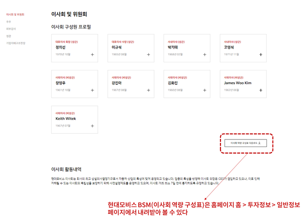 5일 현재 현대모비스는 자사 홈페이지에 BSM(이사회 역량 구성표)을 공개하고 있다. 현대모비스 이사회 역량 구성이 궁금한 주주와 투자자들은 홈페이지에서 BSM 문서를 내려받아 볼 수 있다. 직접 게시하는 형태는 아니다. 기업들이 주로 기업지배구조 보고서나 지속가능경영 보고서, 주주총회 소집공고 등에서 BSM을 공개하는 것과 상이하다.