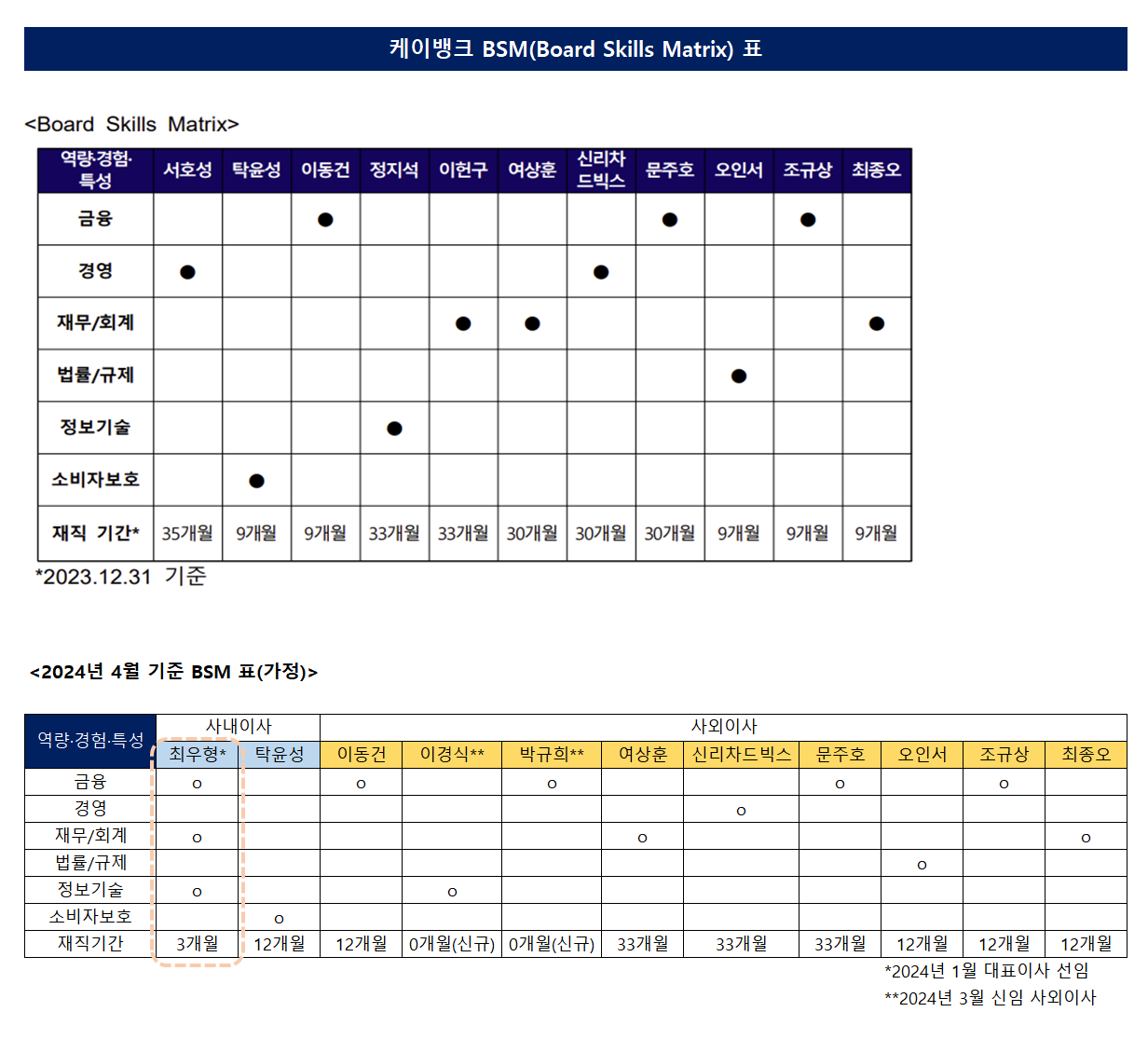 사내이사 가운데서는 최우형 행장과 탁윤성 전무가 각각 금융과 소비자보호 역량을 갖춘 것으로 평가된다. 최우형 행장은 올 1월 새로 선임된 만큼 작년 말 기준으로 공시된 BSM엔 등장하지 않았다. 그는 금융권과 IT업계를 모두 경험한 디지털금융 전문가로 평가되는 만큼 케이뱅크 BSM 여러 항목의 역량을 보유하고 있다는 평이다.