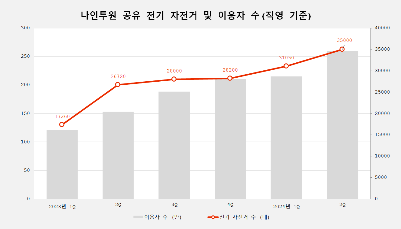 나인투원의 '외형 성장' 전략이 어느 정도 성과를 거둔 모습이다. 가맹 방식으로 1만대 이상의 자전거를 운용하겠다는 올해 목표를 이미 상반기 중 달성했다. 나인투원은 목표치를 1만3000대로 다시 잡았다.