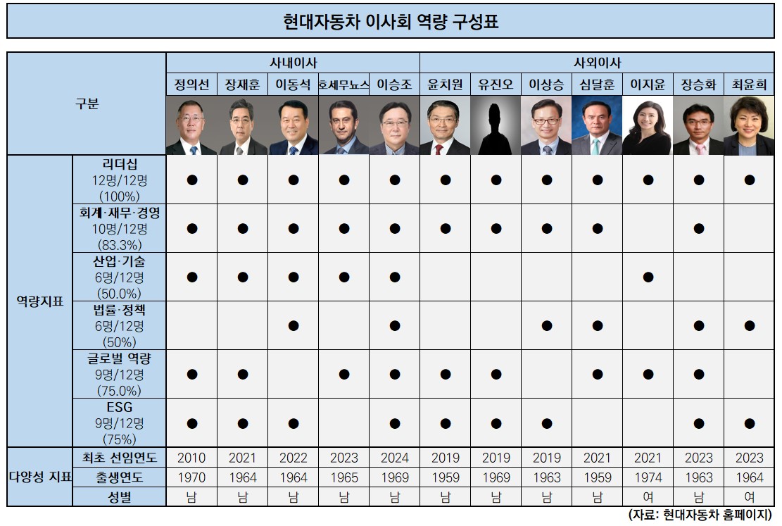 현대자동차 이사회는 사내이사 5명과 사외이사 7명 등 총 12명의 이사로 구성돼 있다. 각각의 이사들은 많게는 6개 적게는 3개 역량지표에 이름을 올렸다. 이사들이 가장 많이 보유한 역량은 '리더십'으로 사내·외 이사 전원이 해당 역량을 갖췄다고 평가했다. 회계·재무·경영 항목의 경우 10명(83%)의 사내·외 이사가 체크, 두 번째로 많았다.