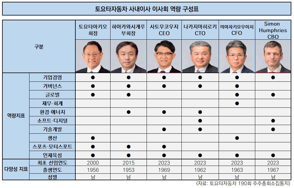 스포츠·모터스포츠 항목에 이름을 올린 인사는 16명의 사내·외이사와 사내·외감사를 통틀어 토요타아키오 회장과 하야카와시게루 부회장, 사토우코지 사장, 필립크레이븐 사외이사 등 4명에 불과했다. 정책 분석 능력을 가리키는 소프트·디지털 영역의 경우 16명 임원 중 두 명의 사내이사와 한 명의 사외이사 등 3명만이 이름을 올렸다.