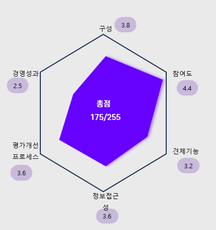 각 문항 당 평균 점수가 가장 높았던 항목은 참여도 항목이었다. 총 8개 문항으로 구성된 참여도 항목 점수 합계는 40점 만점에 32점이었으며 문항 평균 점수는 5.0점 만점에 4.4점이었다. 이사회 구성 항목이 3.8점을 기록했고 정보접근성과 평가개선프로세스 등 두 항목이 각각 3.6점이었다. 견제기능 항목이 3.2점, 경영성과 항목이 2.5점이었다.