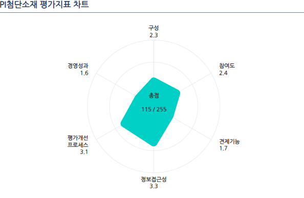 뒤늦게 개편에 돌입한 만큼 THE CFO가 평가한 PI첨단소재 이사회 점수는 총점 255점 중 122점으로 다소 미흡한 것으로 나타났다. 이사회는 △구성 △참여도 △견제 기능 △정보 접근성 △평가 개선 프로세스 △경영 성과 등 6가지 공통 지표(각 5점 만점)로 평가했다. 올해 5월 발표한 기업 지배구조 보고서와 지난해 사업보고서 등이 기준이다.