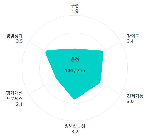 구성 분야 평균 점수는 1.9점으로 집계됐다. 9개 평가 항목에서 17점을 받았다. 구성 분야 평가 항목은 사외이사의 이사회 의장 선임 여부, 사외이사 비율, 사외이사 소위원회 위원장 선임 여부, 이사회 규모, 이사회 내 위원회 수, 사외이사후보추천위원회 구성, BSM(Board Skills Matrix) 활용 여부, 다양성, 지원조직 유무 등이다.
