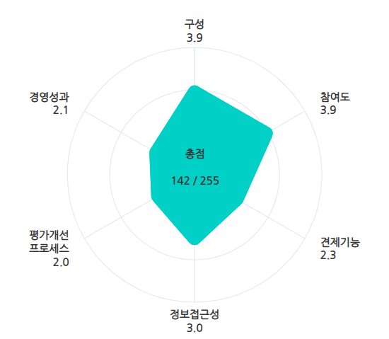 '경영성과' 항목에서도 아쉬운 평가를 받았다. 경영성과는 총점 55점 만점에 23점으로 평점은 2.1점이다. 11개 지표 중 투자와 재무건전성 등 8개 문항에서 각 1점씩 받았다. 지난해 주가순자산비율(PBR)은 1.22배로 KRX 300 평균치 2.38배를 하회했다. 주가수익률과 총주주수익률(TSR)은 마이너스(-)를 기록했다. 주가수익률은 -17.94%며 TSR은 -17.9%를 기록했다.