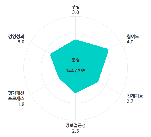 구성 분야 평균 점수는 3점으로 집계됐다. 9개 평가 항목에서 27점을 받았다. 구성 분야 평가 항목은 사외이사의 이사회 의장 선임 여부, 사외이사 비율, 사외이사 소위원회 위원장 선임 여부, 이사회 규모, 이사회 내 위원회 수, 사외이사후보추천위원회 구성, BSM(Board Skills Matrix) 활용 여부, 다양성, 지원조직 유무 등이다.