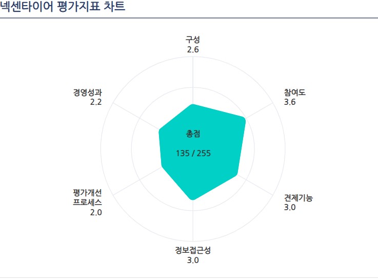 반면에 5점 만점에 3.6점을 받으며 좋은 평가를 받은 항목도 있다. 바로 이사회 참여도 항목이다. 사외이사 후보 풀(pool)에 대한 관리가 정기적으로 수행된는 점에서 높은 점수를 받았다.