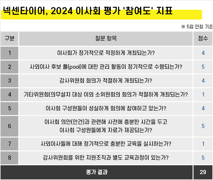 넥센타이어가 이사회 및 개별 사외이사에 대한 평가 체계 확립에는 약점을 보였으나 이사회 참여도 항목에선 높은 점수를 기록했다. 참여도 항목 평균 점수는 5점 만점에 3.6점으로 집계됐다. 8개 항목에서 29점을 받았다. 참여도 항목은 이사회 개최 횟수, 사외이사 후보군 관리, 감사위원회 개최 횟수, 기타위원회 개최 횟수, 이사회 참석률, 이사회 안건 사전 제공, 사외이사 교육, 감사위원회 교육 및 지원 조직 등이다.