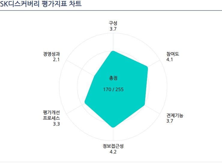 SK디스커버리는 6개 평가 항목 중 5개에서 3점대 이상의 평균 점수를 기록했다. 그러나 '견제기능'에서 개선해야 할 요인이 다수 지적됐다. 견제기능 분야 9개 평가 항목에서 총점 33점을 받아 평점 3.7점을 기록했다. '경영성과'에선 11개 평가 항목 총점 23점으로 평점 2.1점으로 나타나 6개 항목 중 가장 낮은 점수를 받았다.