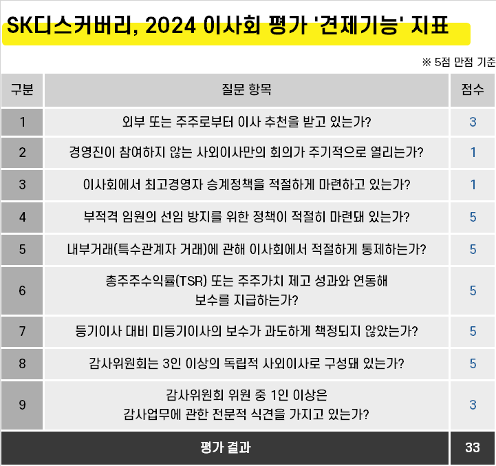 구체적으로 지난해 4월과 7월 신임 사외이사 1인을 대상으로 두 차례 임시 회의를 열었다. 회의 내용은 '거버넌스와 사외이사의 역할'과 '경영시스템으로서의 이사회 평가'에 대한 것이었다. 다만 회의 개최 횟수가 4회 미만으로 낮은 점수를 받았다. 또 SK디스커버리는 CEO 승계정책을 명문화해 운영하지 않고 있어 감점 요인으로 작용했다.