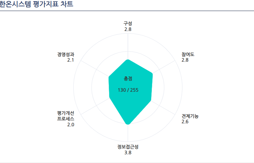 평가 항목은 총 6개로 △구성 △참여도 △견제기능 △정보접근성 △평가 개선 프로세스 △경영성과 등으로 이루어져 있다. 각 항목별로 5점 만점으로 환산하면 한온시스템의 평균 점수는 2.68점이다.