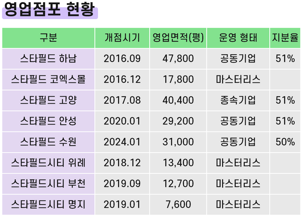 임대수익은 재고나 판매인력 부담이 없기 때문에 꾸준하다는 장점이 있다. 또 스타필드엔 신세계그룹 계열의 대형 브랜드 매장(이마트 트레이더스, 신세계 백화점, 일렉트로마트 등)이 여럿 입점해 있어 운영매장 공실률도 주변 상업시설보다 낮은 2% 내외 수준으로 알려졌다.