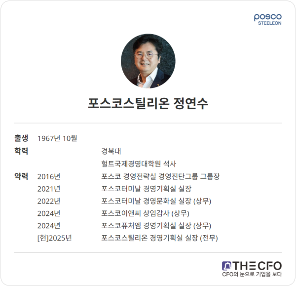 정연수 포스코스틸리온 경영기획실장(CFO) 전무는 1967년생이다. 경북대 경제학과를 졸업했으며 헐트국제경영대학원에서 경영학 석사 학위(MBA)도 취득했다. 포스코그룹에서는 주로 경영관리와 기획 등 분야에서 경력을 쌓았다.