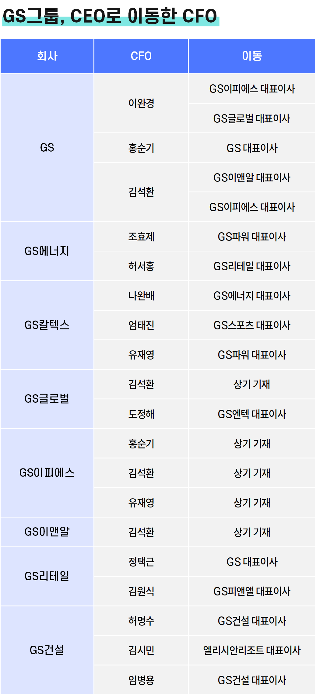특히 지주사인 GS의 CFO들은 한 명도 예외없이 계열사 CEO로 이동했다. 사실상 CEO로 영전하기 위한 징검다리 단계다. 그룹 전체의 자금흐름과 투자전략을 살피는 자리다 보니 인사가 재무적, 전략적 통찰력을 훈련하는 경영자 육성 시스템으로 작용한다고 볼 수 있다.