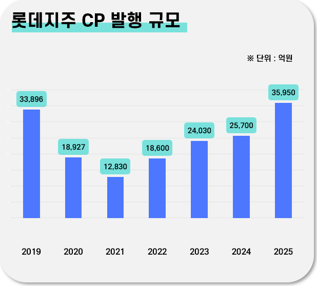 지원 자금은 어떻게 조달했을까. 롯데지주는 회사채보다 기업어음(CP)을 활발하게 이용해왔다. 신규조달, 차환 등을 위해 발행한 CP 규모를 보면 2019년 약 3조4000억원치를 찍었고 2020년부터 2022년까진 연간 1조2000억~1조9000억원 안팎으로 줄었다. 그러다 2023년 다시 2조4000억원 수준으로 확대, 2025년엔 3조5950억원어치를 찍었다.