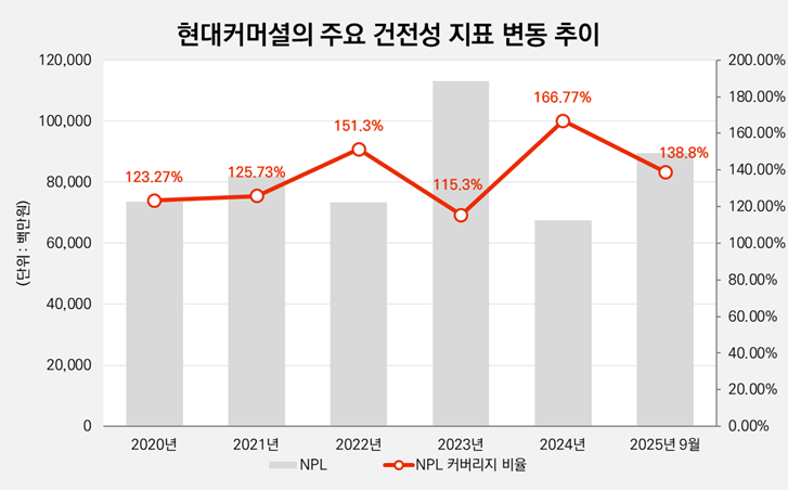 선제적인 부실 채권 관리가 현대커머셜의 핵심 방어 전략이다. 지난해 9월말 기준 1개월 이상 연체율은 0.79% 수준으로 낮게 유지됐다. 부실 채권이 증가했음에도 적극적인 상·매각 처리를 통해 실질적인 연체율을 억제한 결과다. 리스크를 이연하지 않는 관리 기조가 시장 변동성 속에서도 재무 안정성을 확보하는 핵심 동력이다. 이러한 구조 덕분에 추가 부실이 전체 재무 구조로 전이될 위험은 제한적이다.