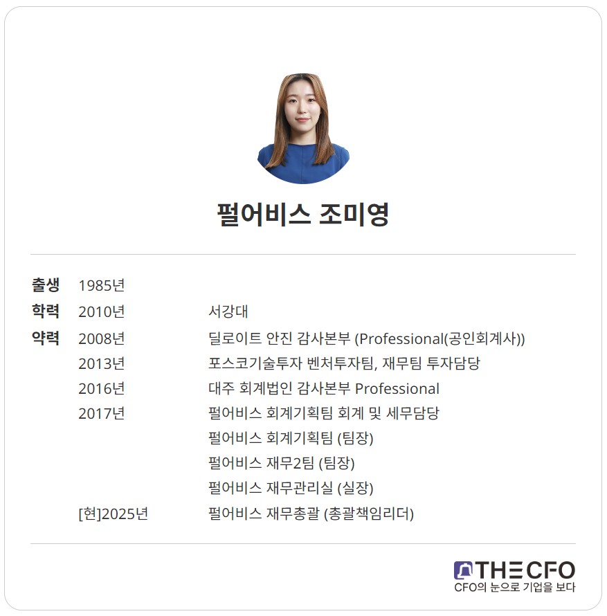 조미영 CFO는 1985년생이다. 2008년 안진회계법인에서 공인회계사로 첫걸음했다. 2013년 포스코기술투자에서 벤처투자팀과 재무팀을 거쳤다. 2016년 대주회계법인으로 적을 옮겨 감사 업무를 담당했다. 2017년부터 펄어비스에 합류해 회계기획팀장과 재무2팀장, 재무관리실장을 역임한 후 재무총괄책임리더가 됐다.